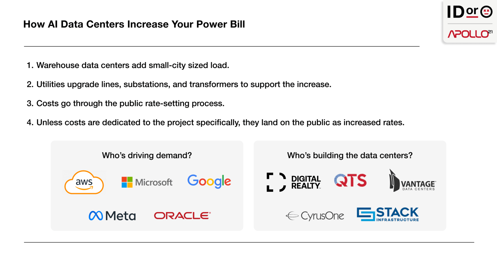 If you're a two-person AI startup, none of this touches you directly. But you, like the rest of us, are beholden to the likes of AWS, Microsoft, Google, Meta, and Oracle, plus the data center landlords building the warehouses for them, companies like Equinix, Digital Realty, QTS, Vantage, CyrusOne, and STACK, who are building warehouse-sized data centers that consume power like small metropolises. The rarefied few have the power to demand entitlement. The rest of us just foot the bill.
