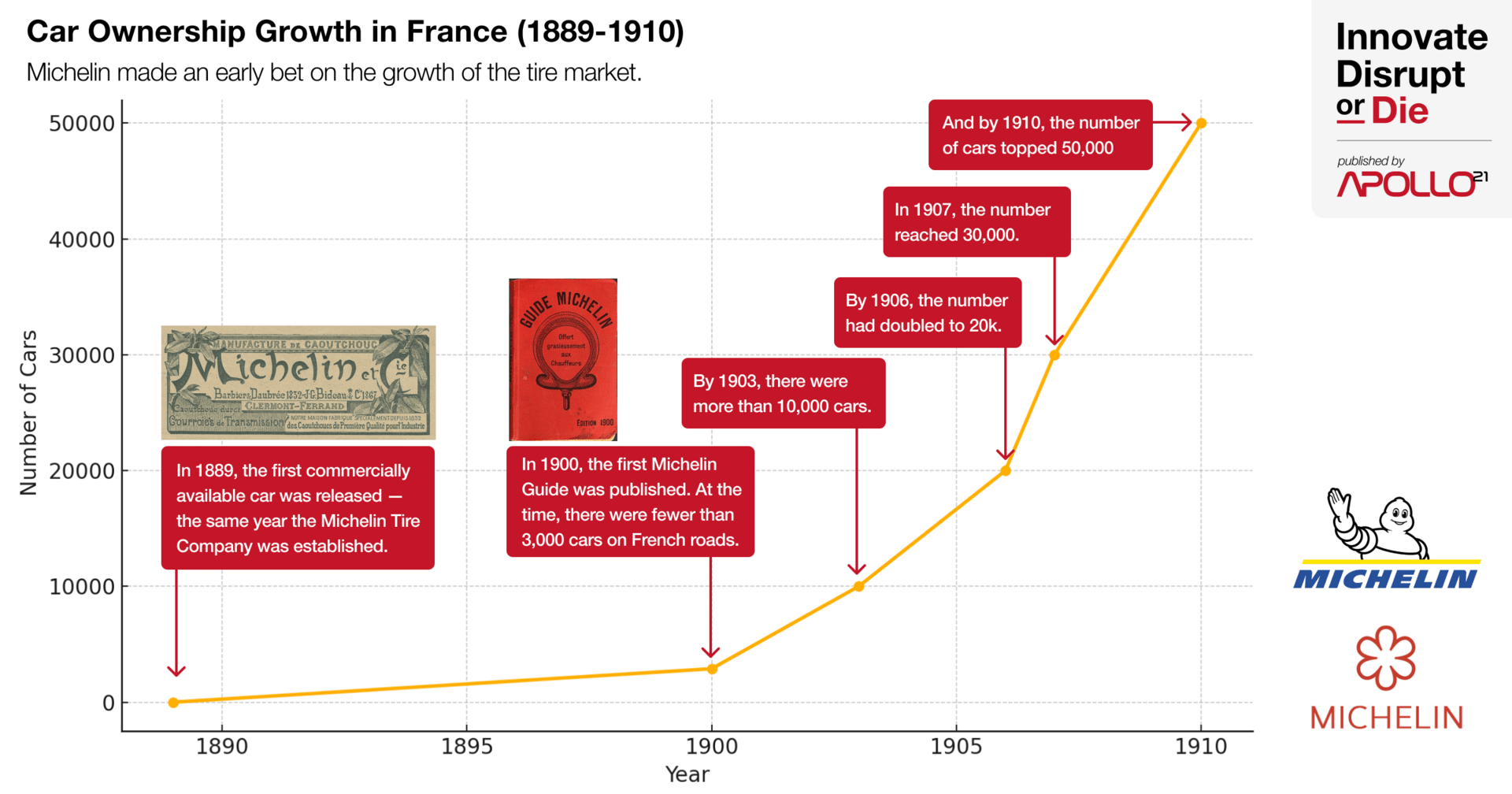 In 1900, France had roughly 3,000 cars on the road. Michelin, then a newly minted tire company, had a product few people needed. So instead of focusing their innovation efforts on improving that product, they turned their attention to engineering demand.