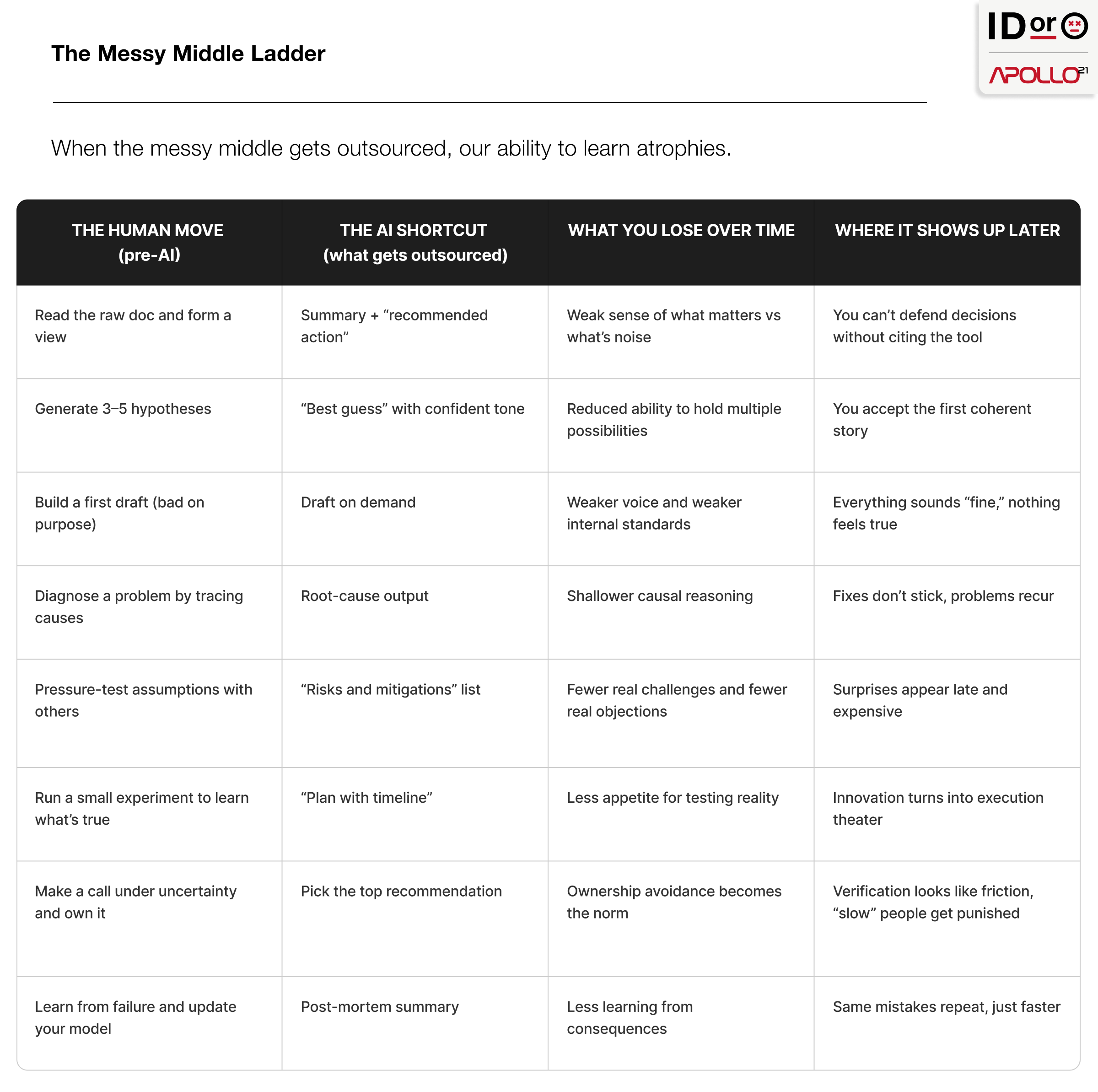 And it’s not just individuals. It’s teams. If the messy middle disappears, expertise stops reproducing. You end up with lots of people who can produce outputs and fewer people who can explain why the output is right, what would make it wrong, and what to do when reality doesn’t match the recommendation.